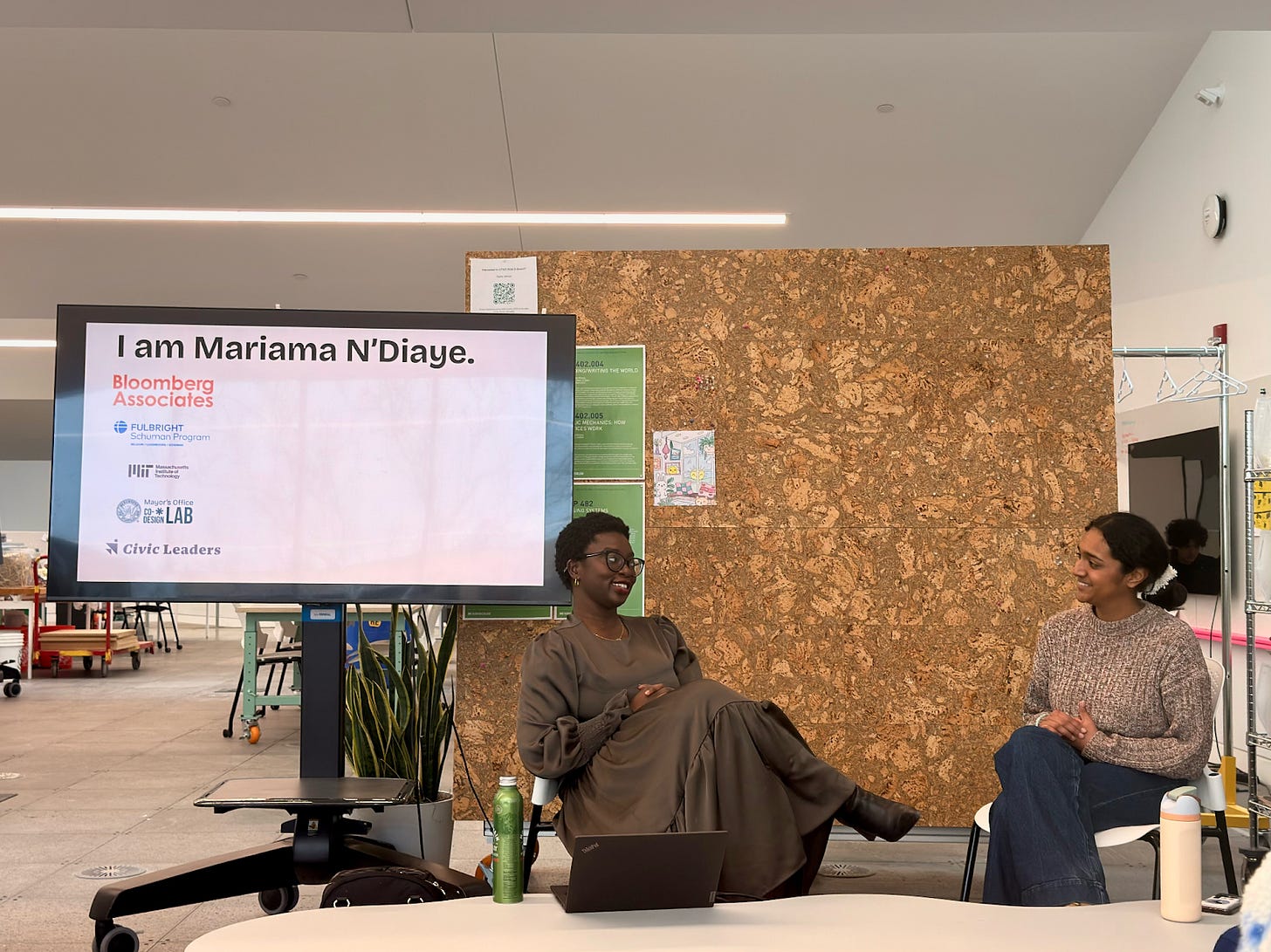 Even before her guest lecture started, one of N’Diaye’s guiding principles became apparent just from observing how she introduced herself, interacted with others, and met everyone with a smile and a handshake. Putting “relationships over requests” is not just something she preaches, but what she embodies and practices, even here on campus. Any business student could tell you that your network is your net-worth, but in a civic design context, relationships are the raw material of co-creation, whether that is of products, policies, or outcomes in the public realm. This is not just to build buy-in or to check a community engagement box, but to create space for people to feel seen and heard throughout the design process. In this way, integrating care into civic work is not just the prioritization of a moral value, but can be the foundation for innovation in a more just and pluralistic society.