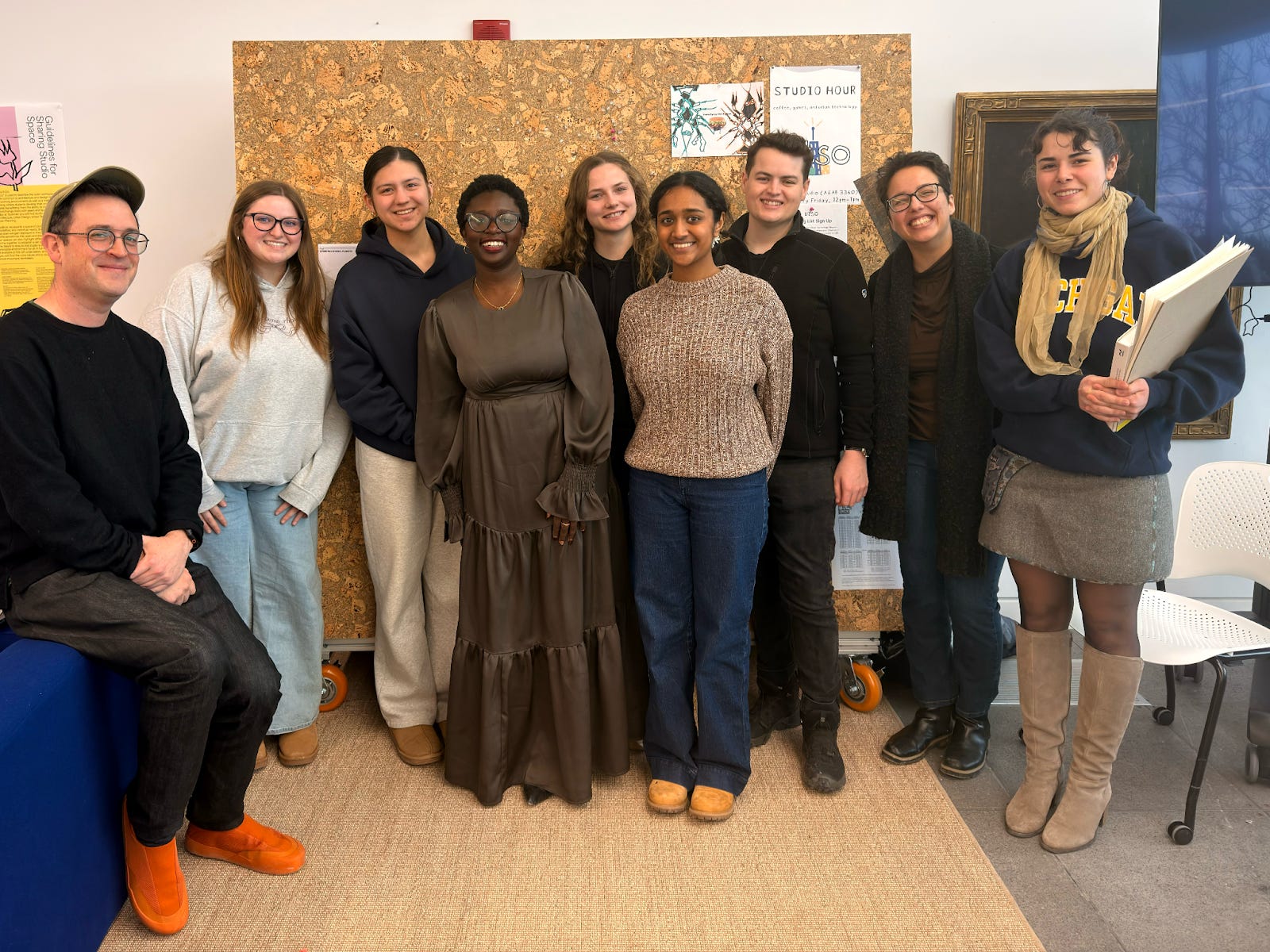 This semester we have, for the first time, a poster full of all the lectures that we’re hosting in the UT Studio and in the building. I’ve been dreaming of this for a while, so it’s gratifying to finally have a collection of inspiring people who all said yes to visiting us and sharing their work and thinking with the students. Such a simple thing, the lecture series, and yet it feels like this is the thing that anoints us—finally!—as a real community of thinkers, question-askers, bull$&%@-callers. In other words, people who care.